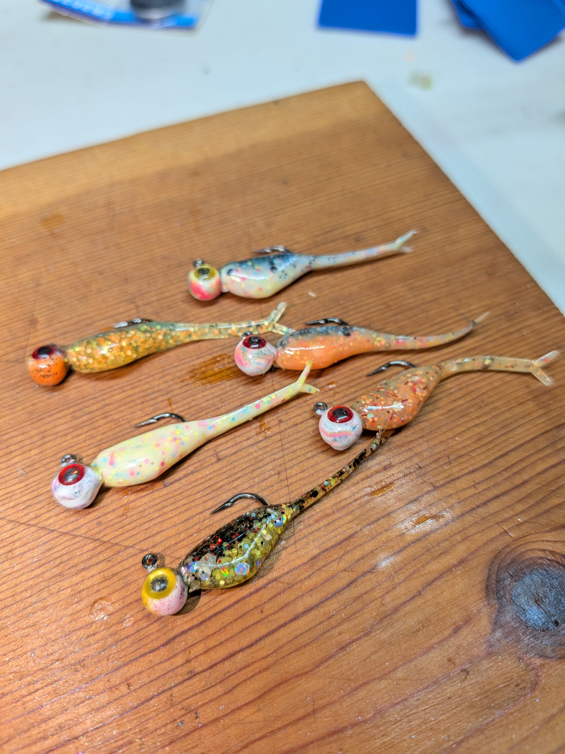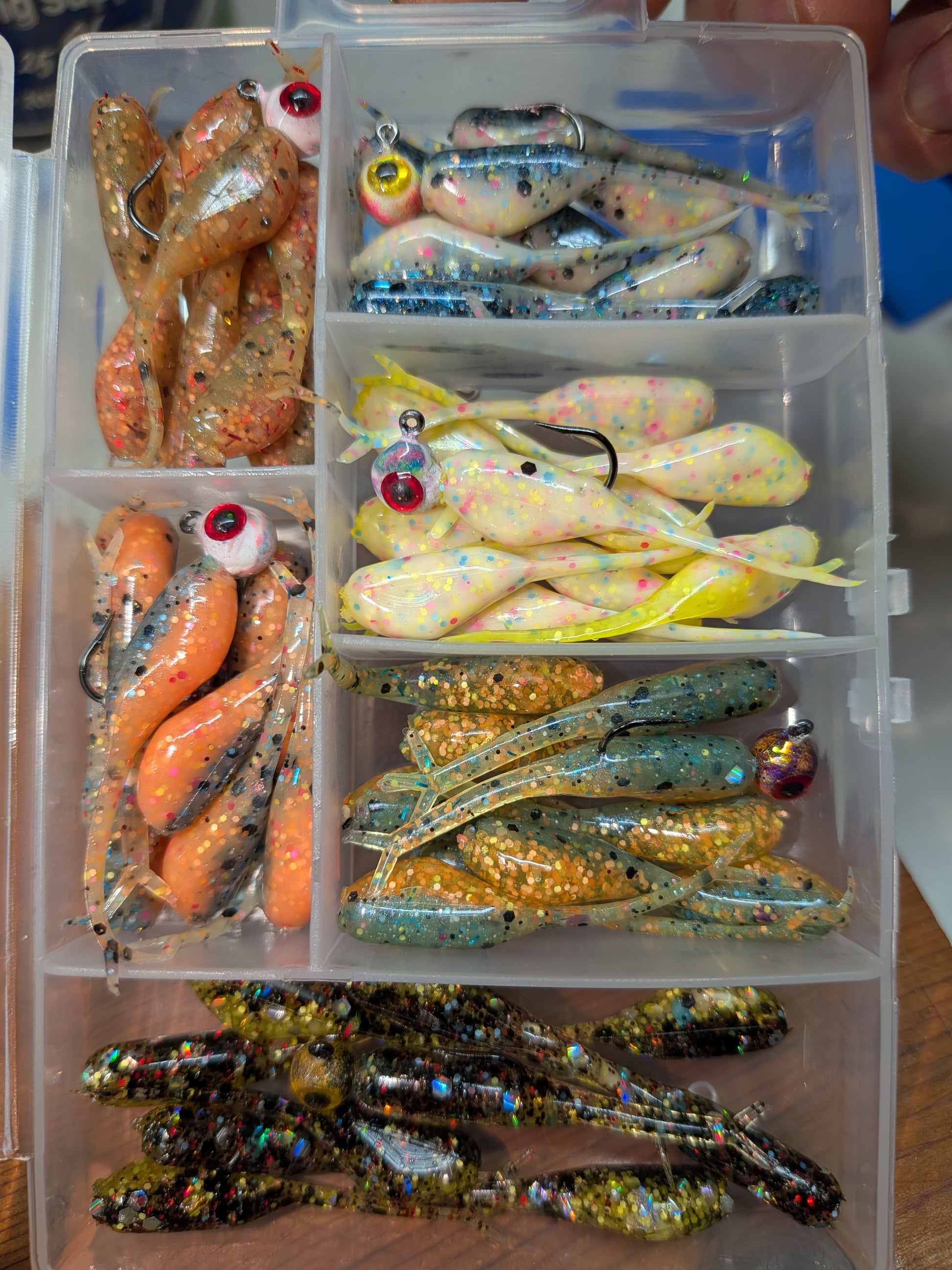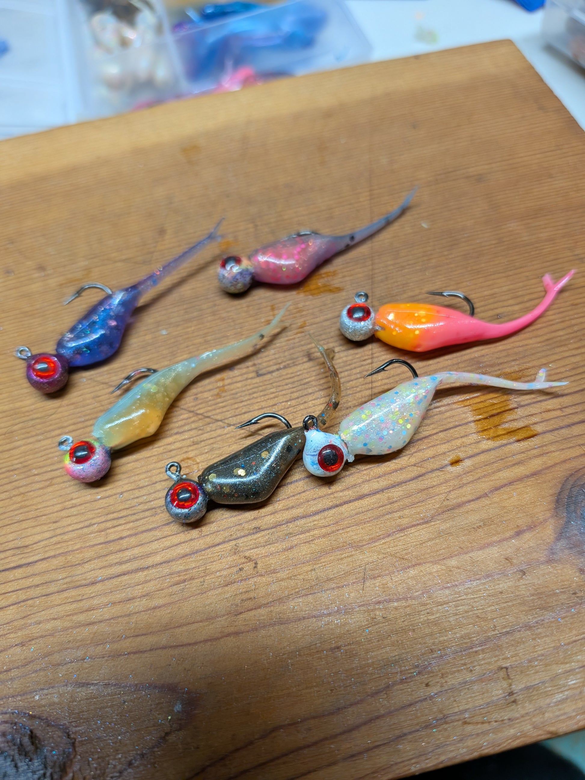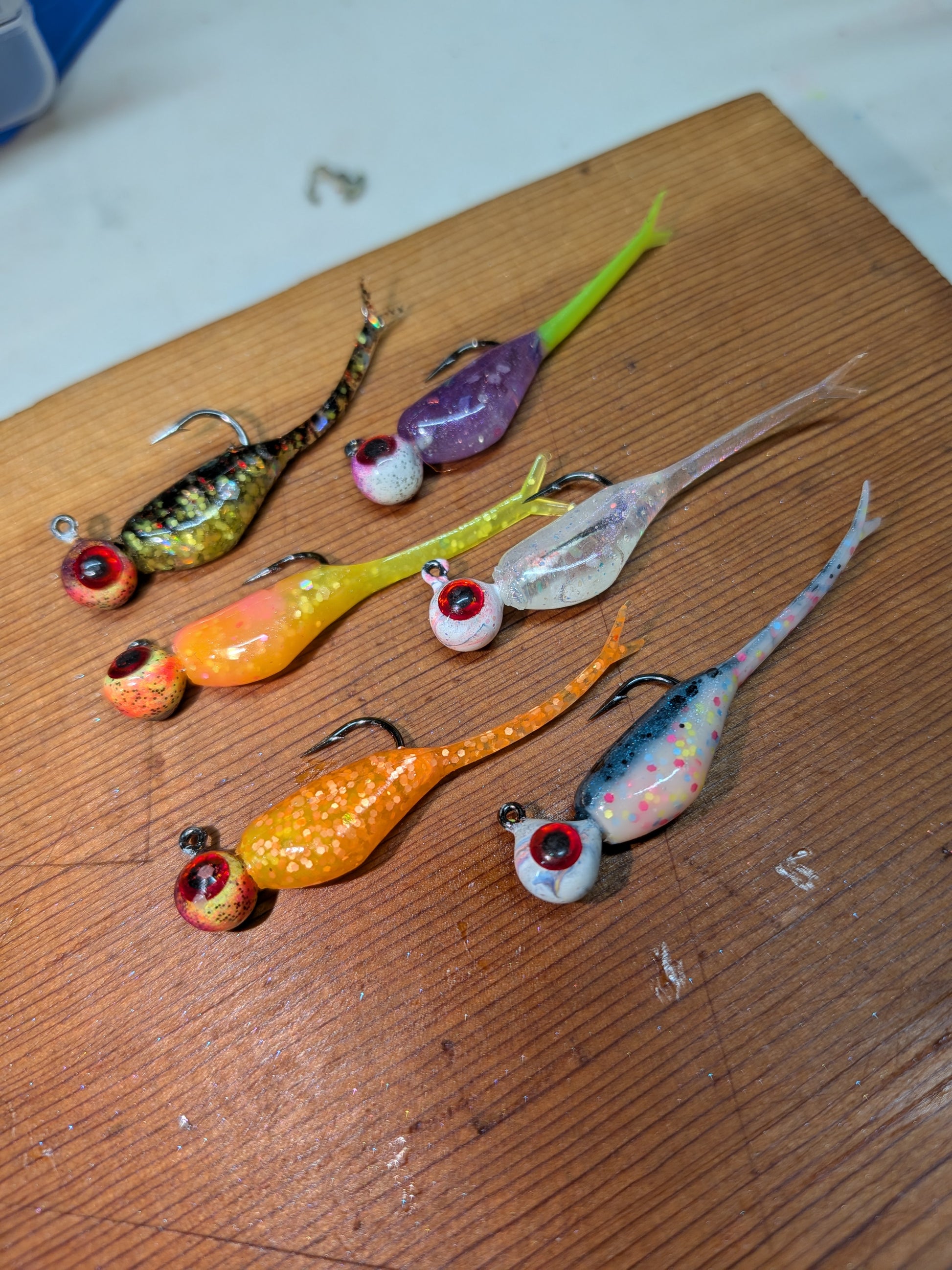 1.5" FC Split Tail Shad with matching 1/32oz Lead Head Jigs.