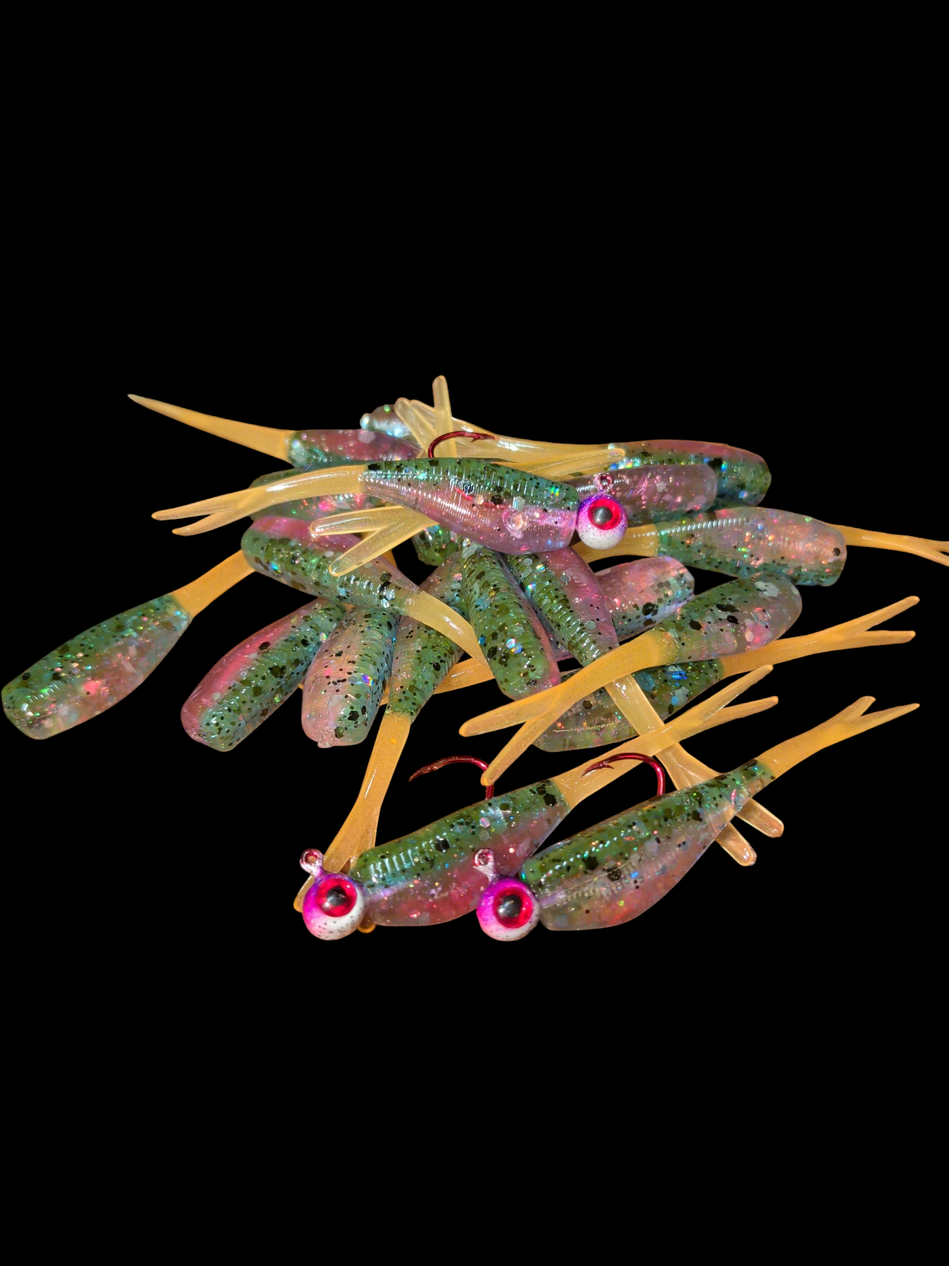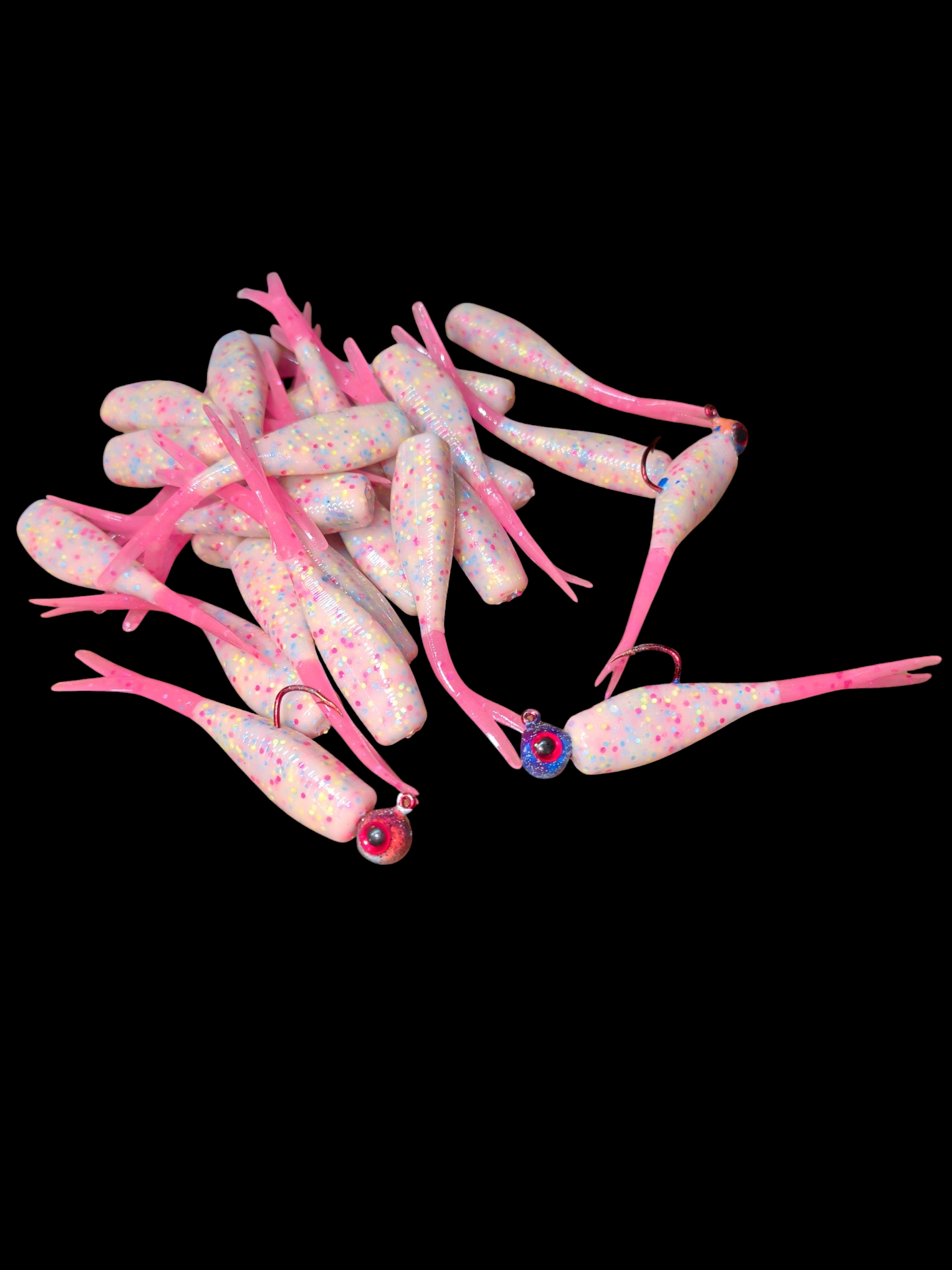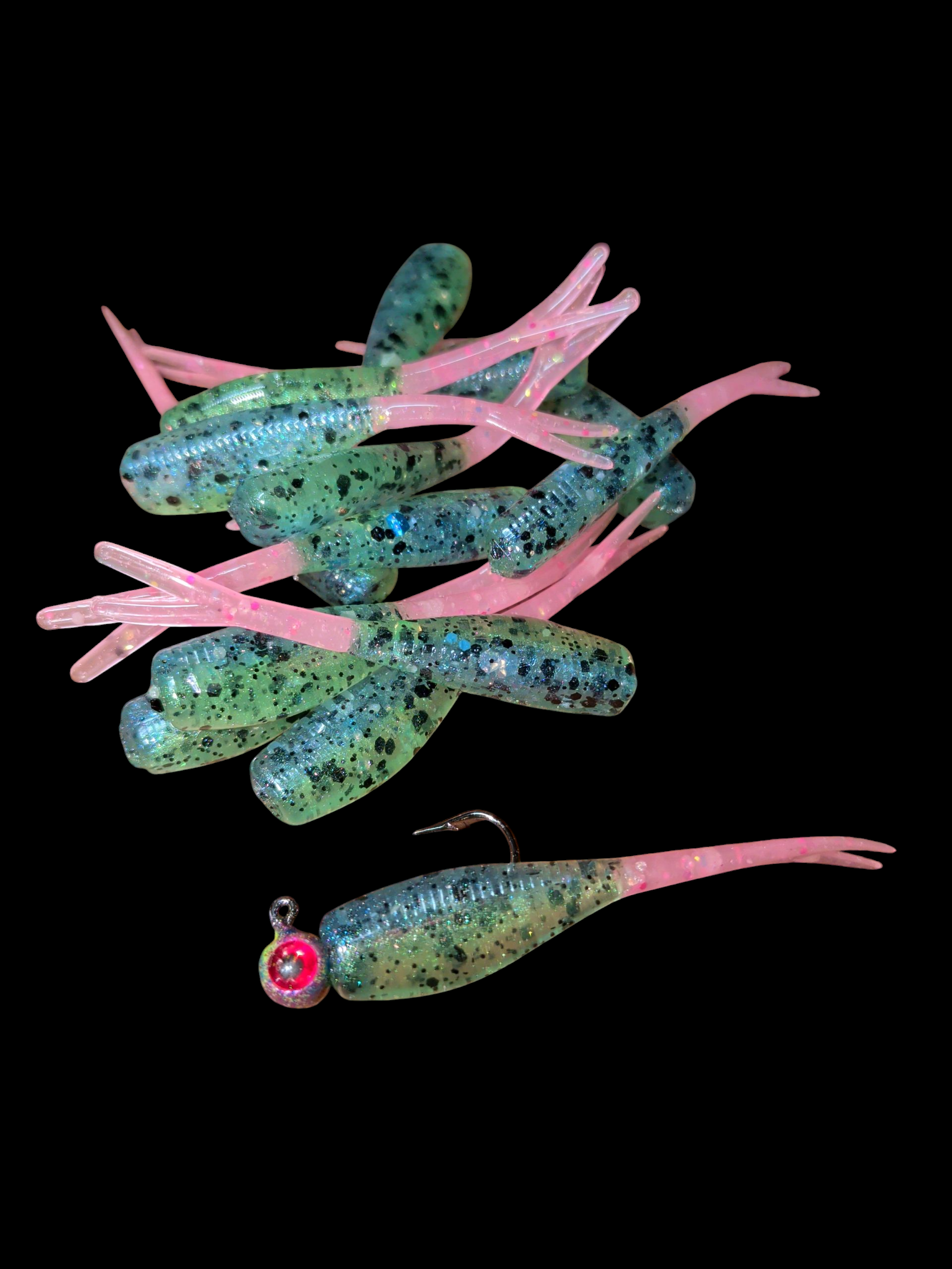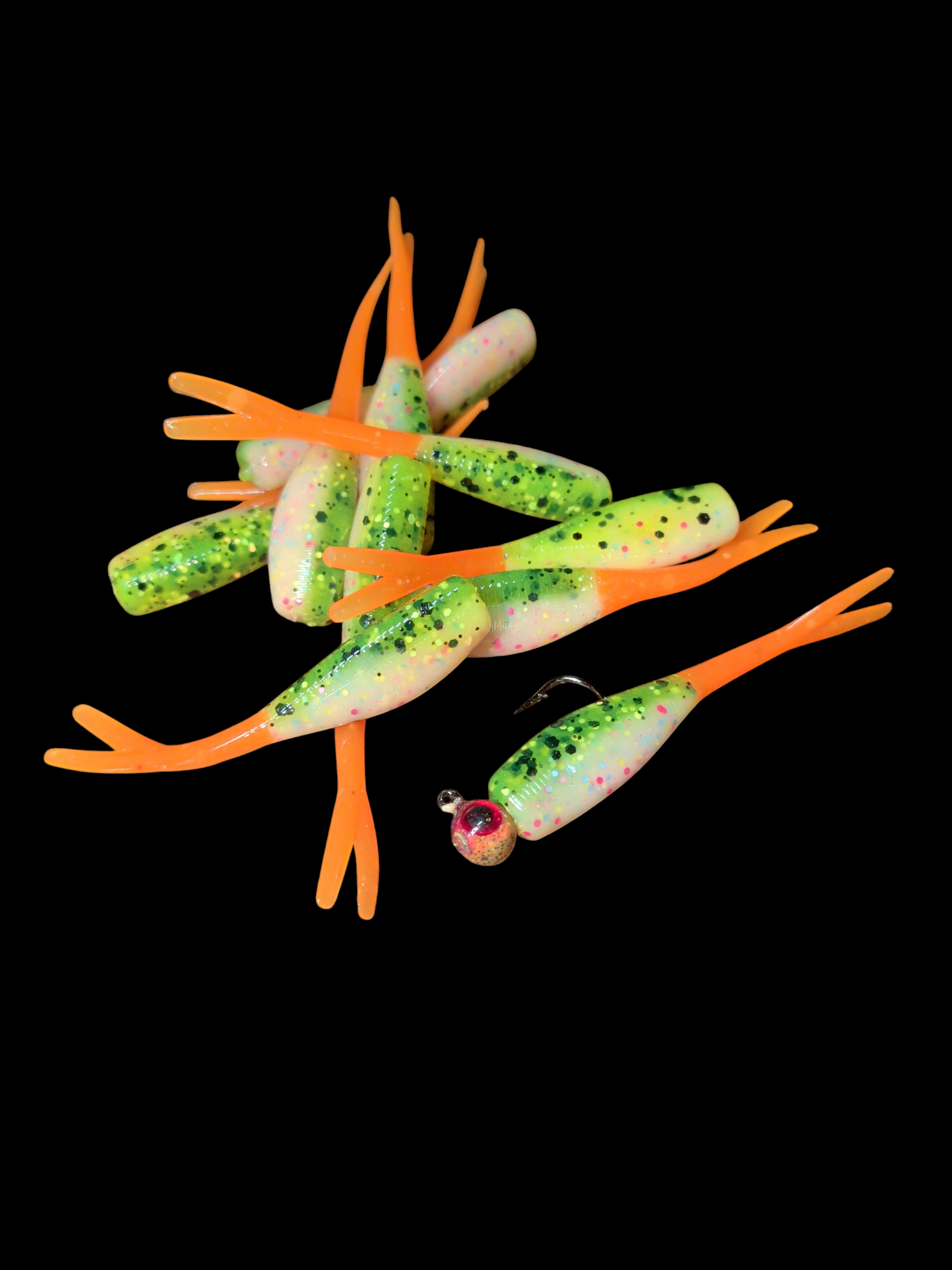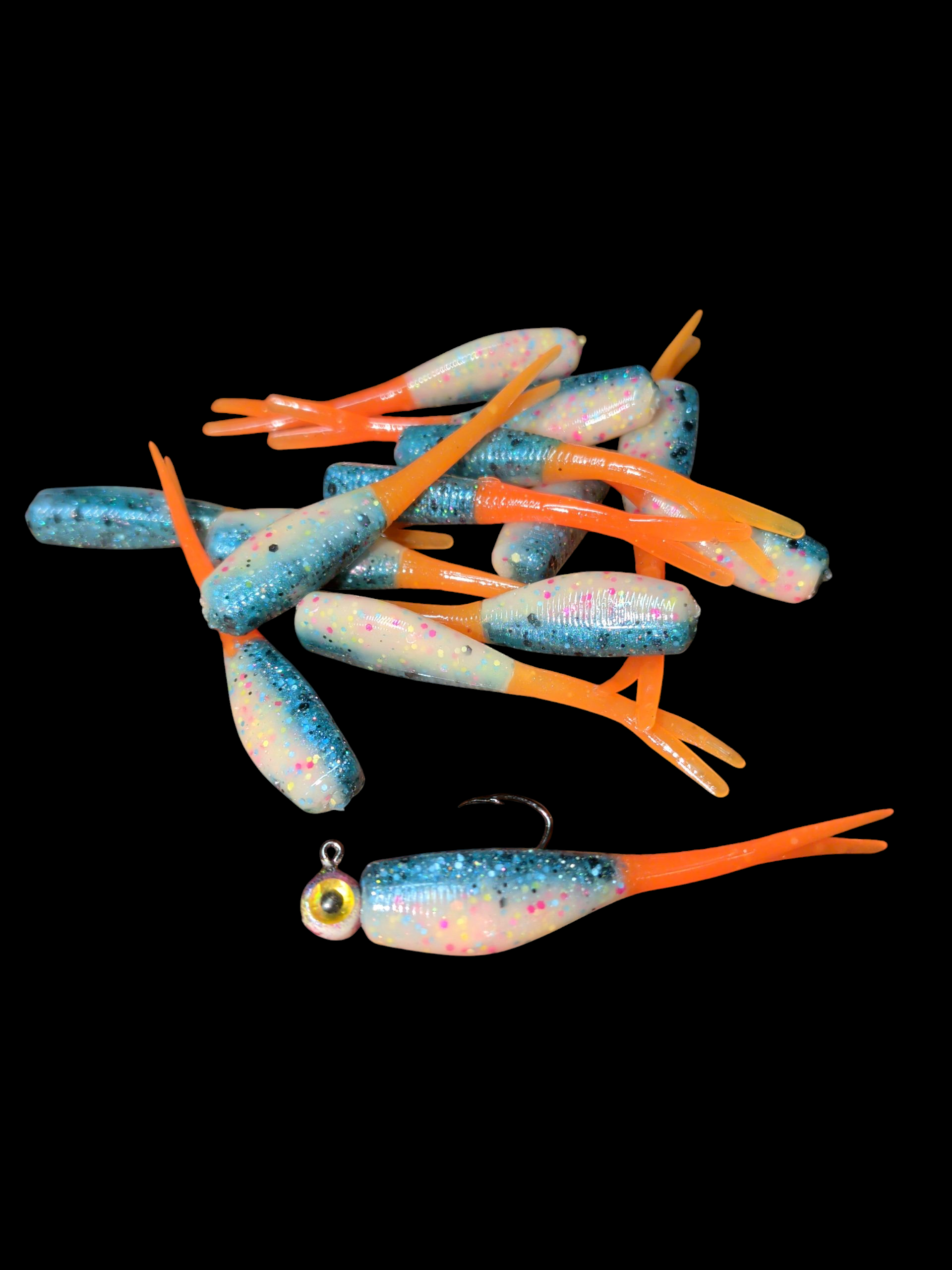 Includes a selection of 10 custom 2" FC Split Tail Shad (10 each) and 14 - 1/32oz Lead Head Jigs. Baits and Jigs glow in the dark.