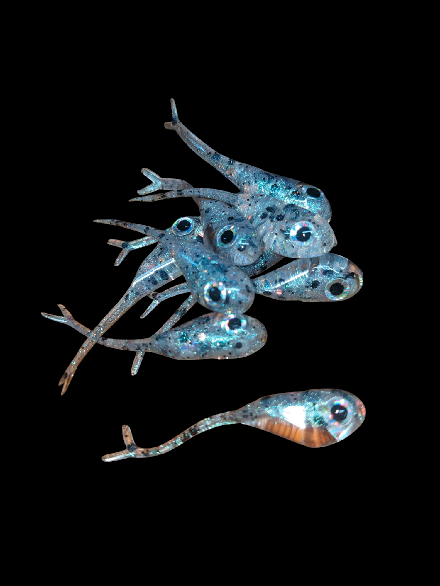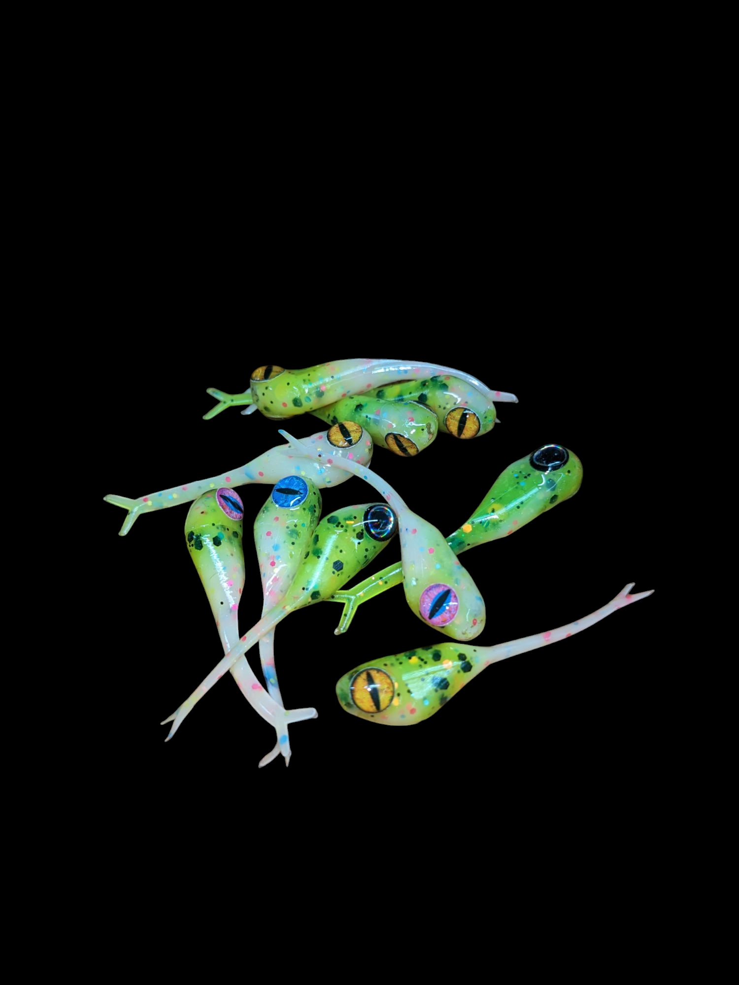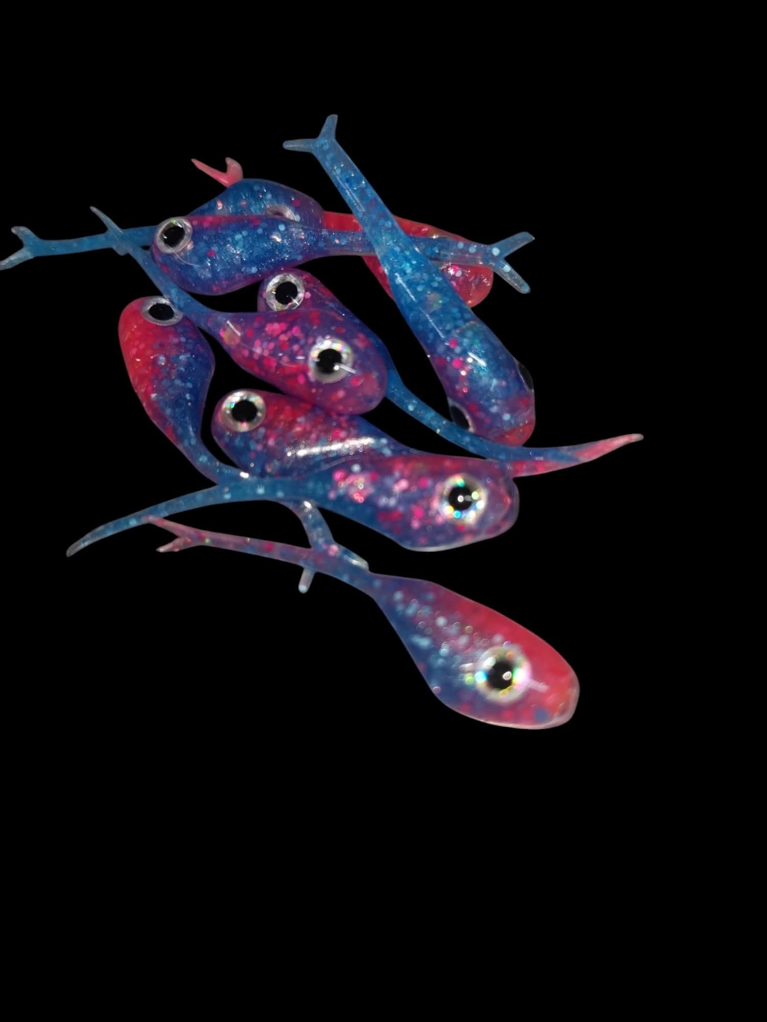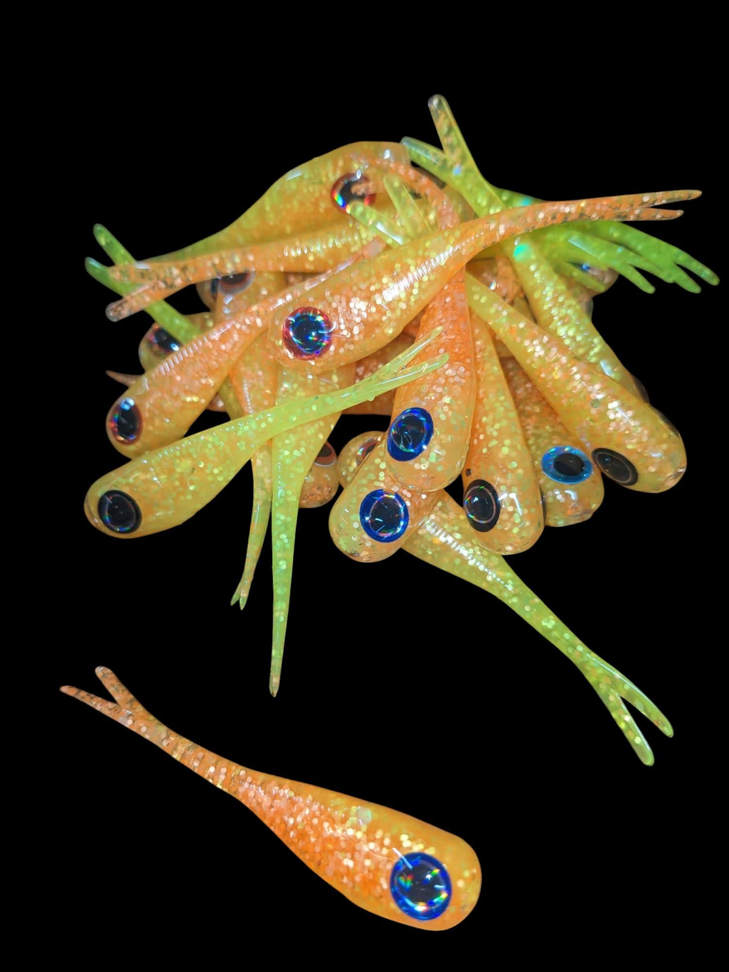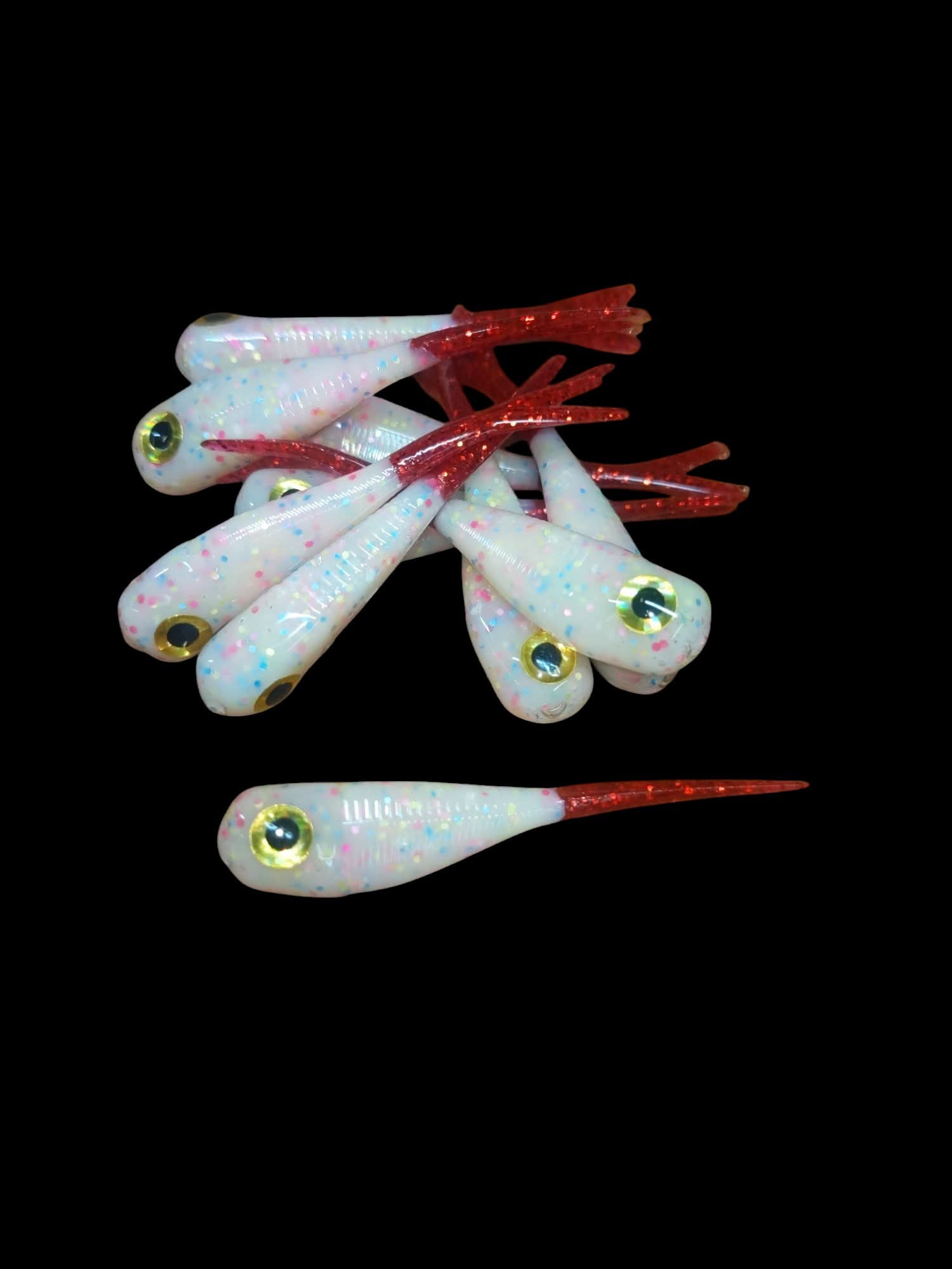 An added dimension on the Split Tail Shad pattern. Attached eyes and a clear dip gives these baits a natural and unique look.