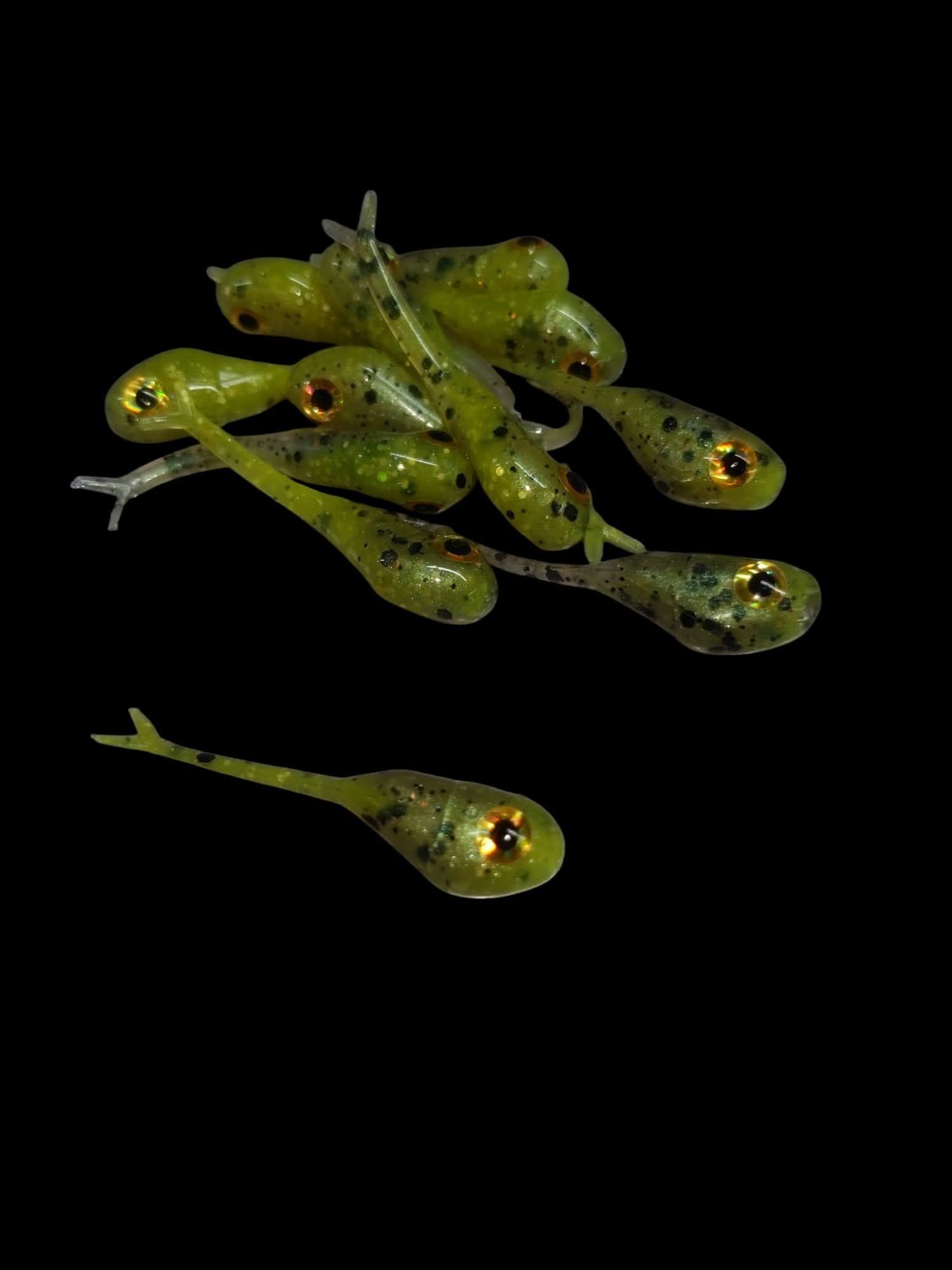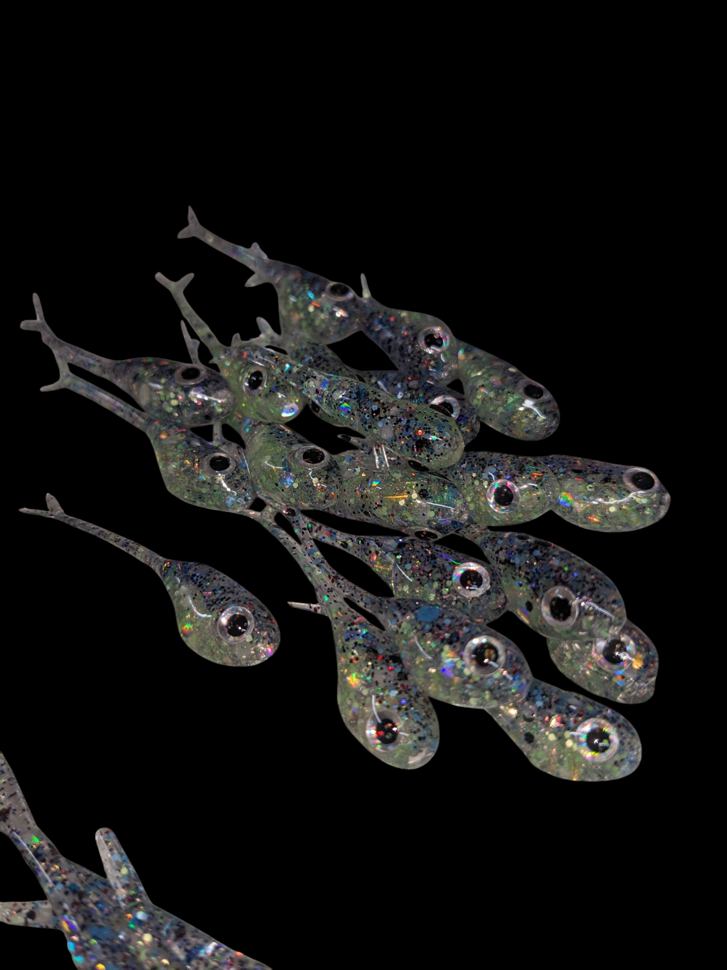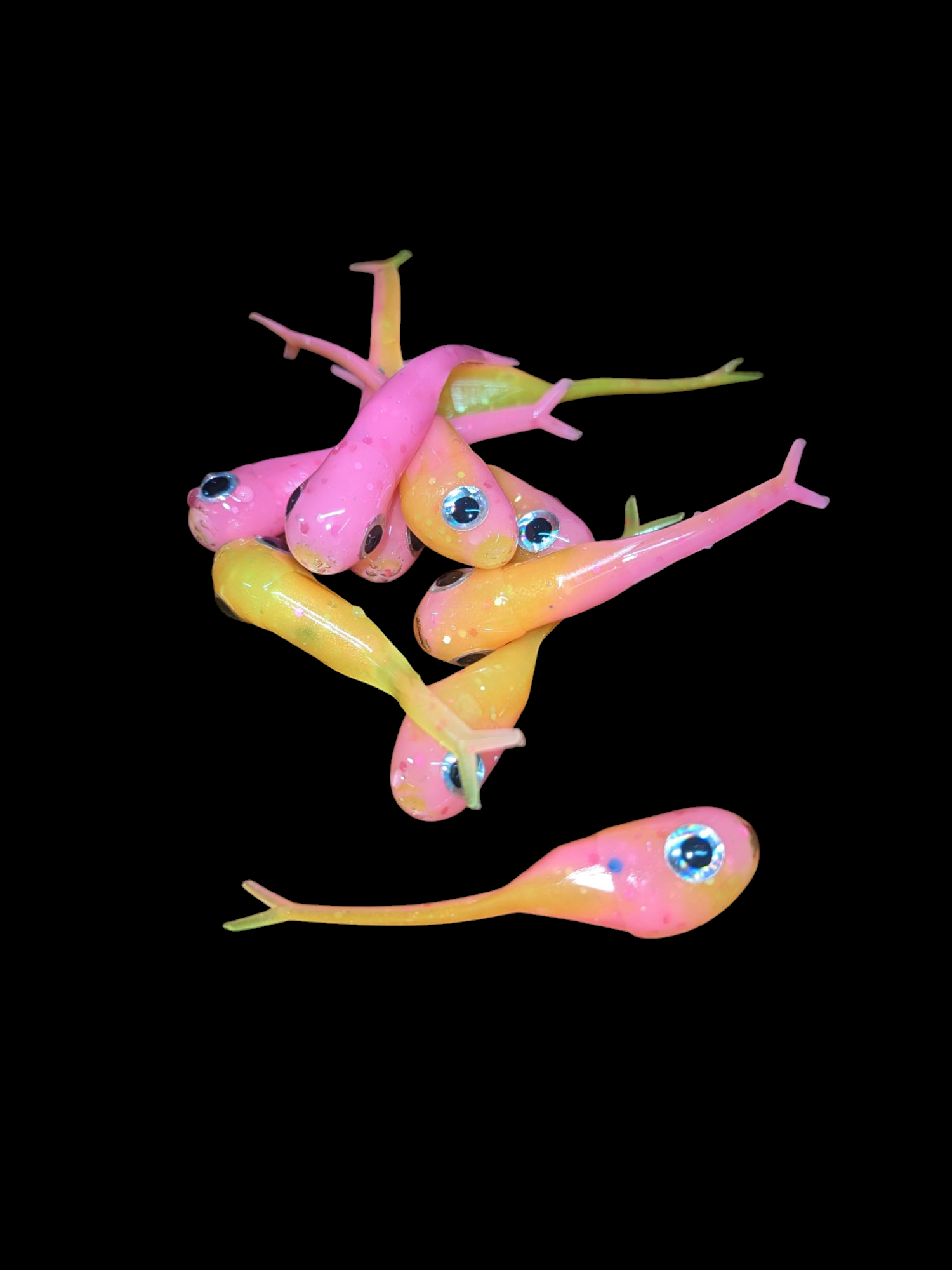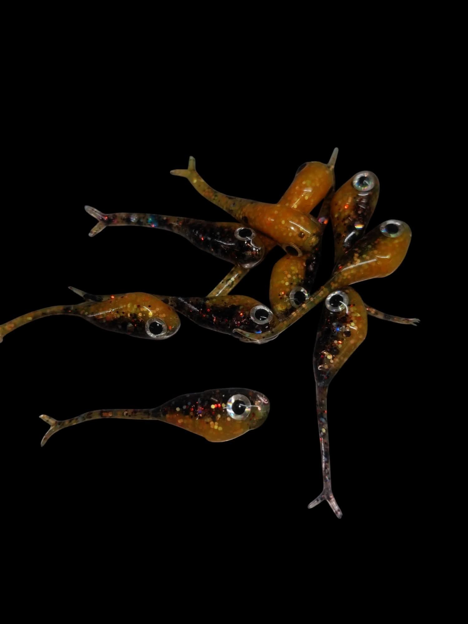 An added dimension on the Split Tail Shad pattern. Attached eyes and a clear dip gives these baits a natural and unique look.