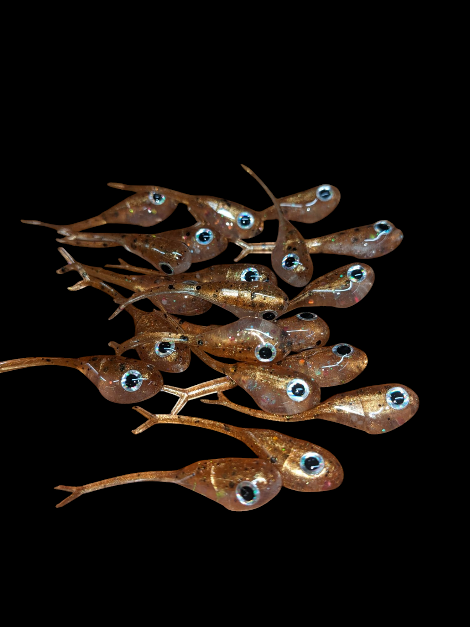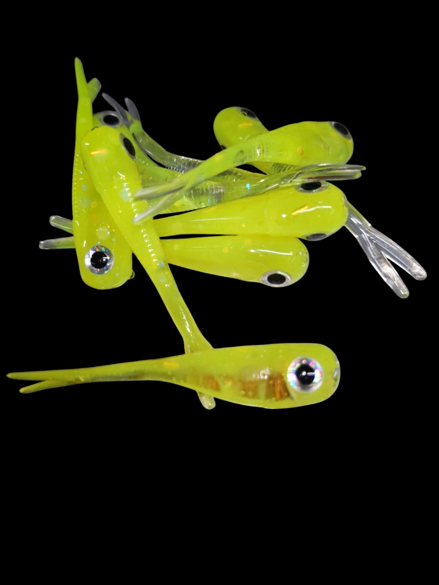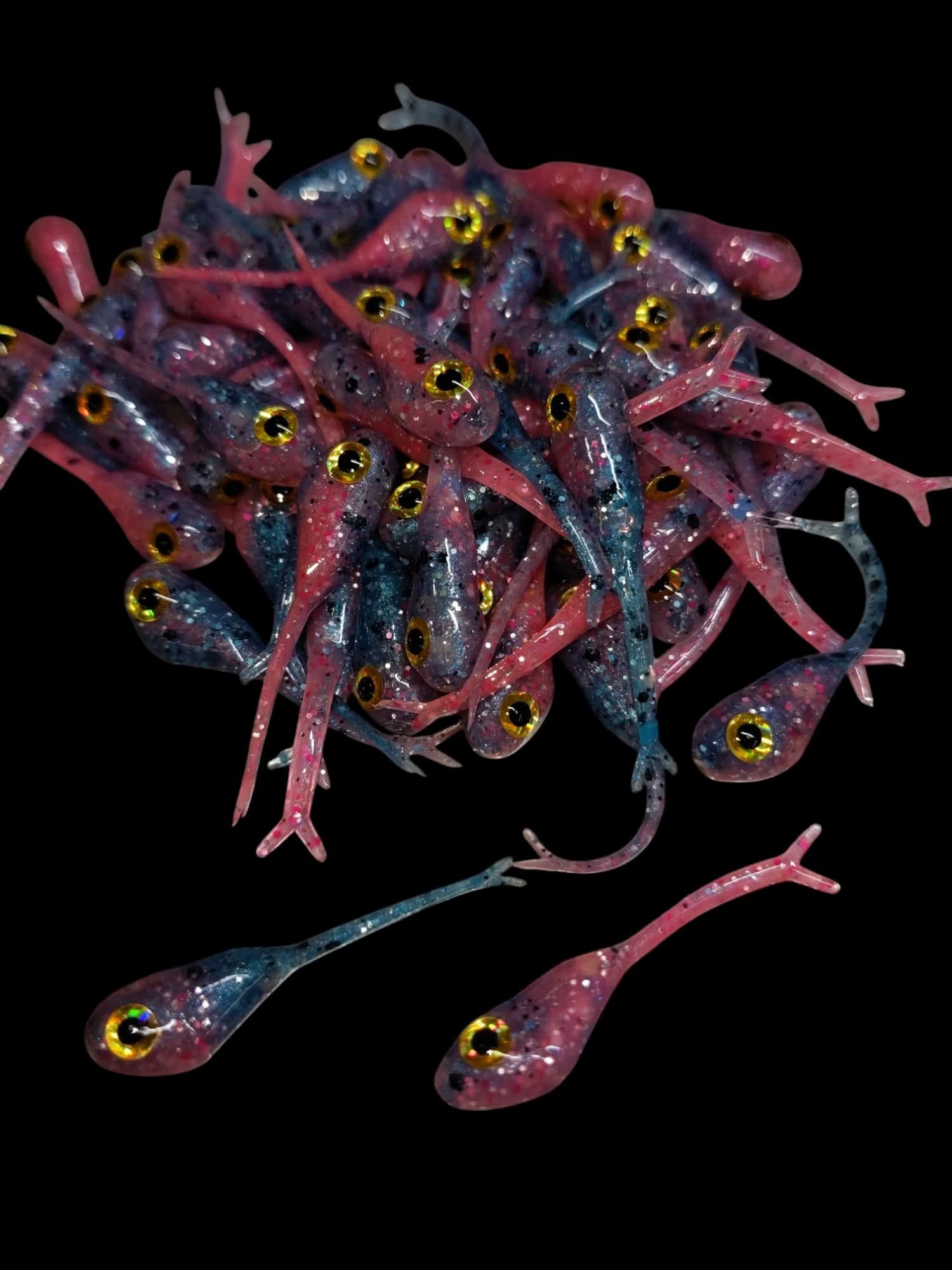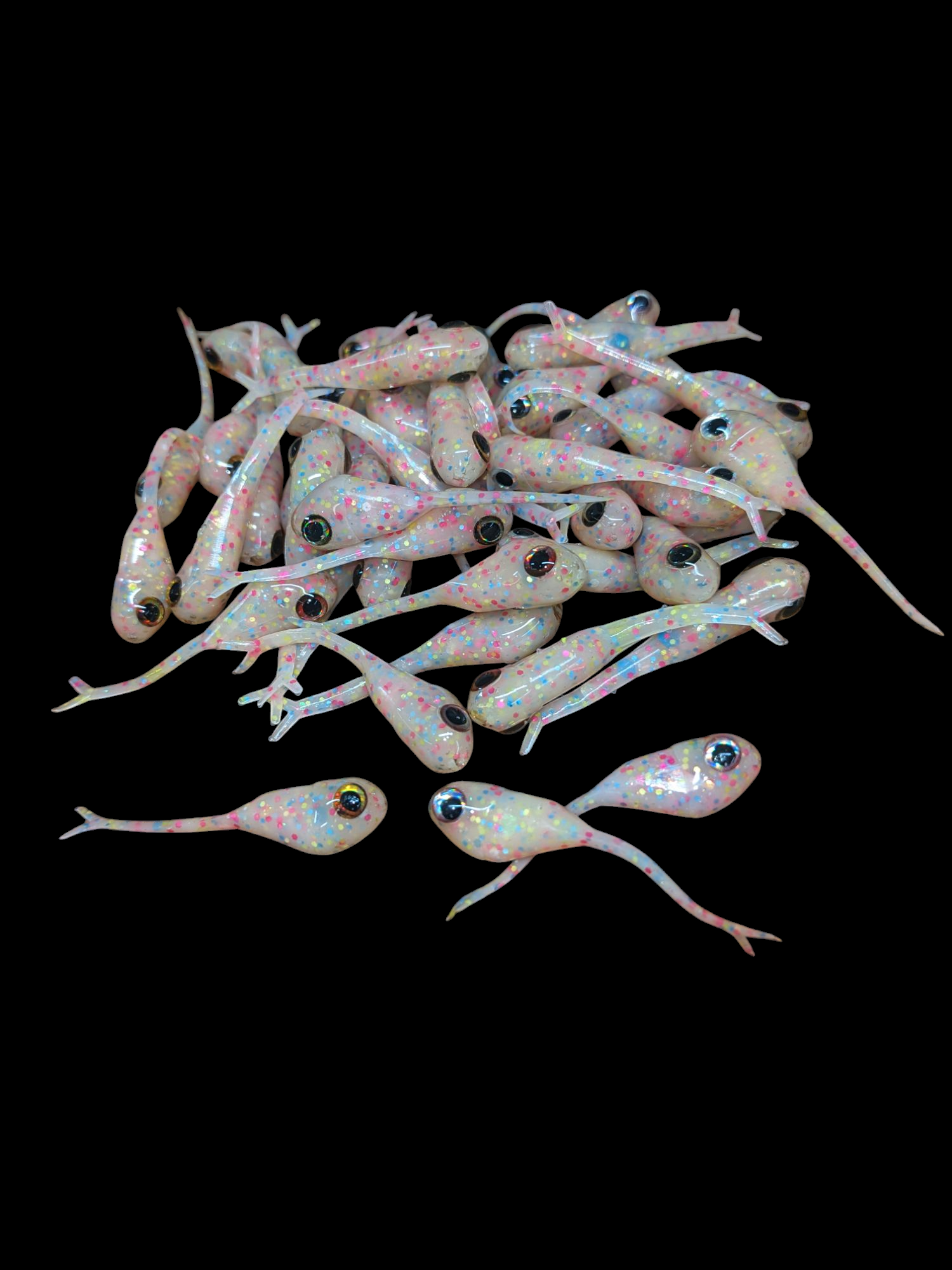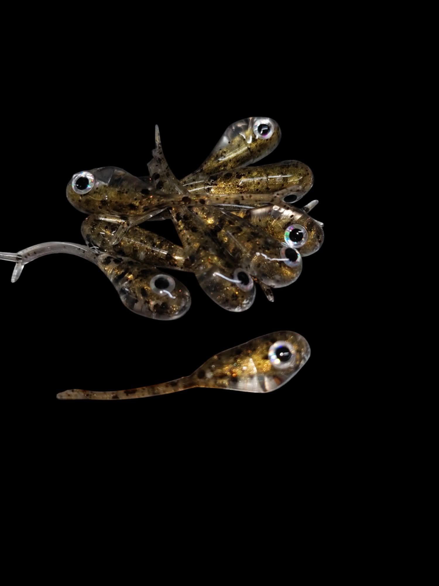 An added dimension on the Split Tail Shad pattern. Attached eyes and a clear dip gives these baits a natural and unique look.