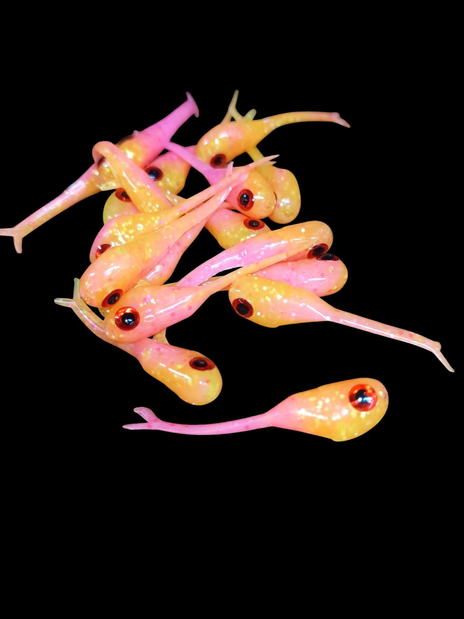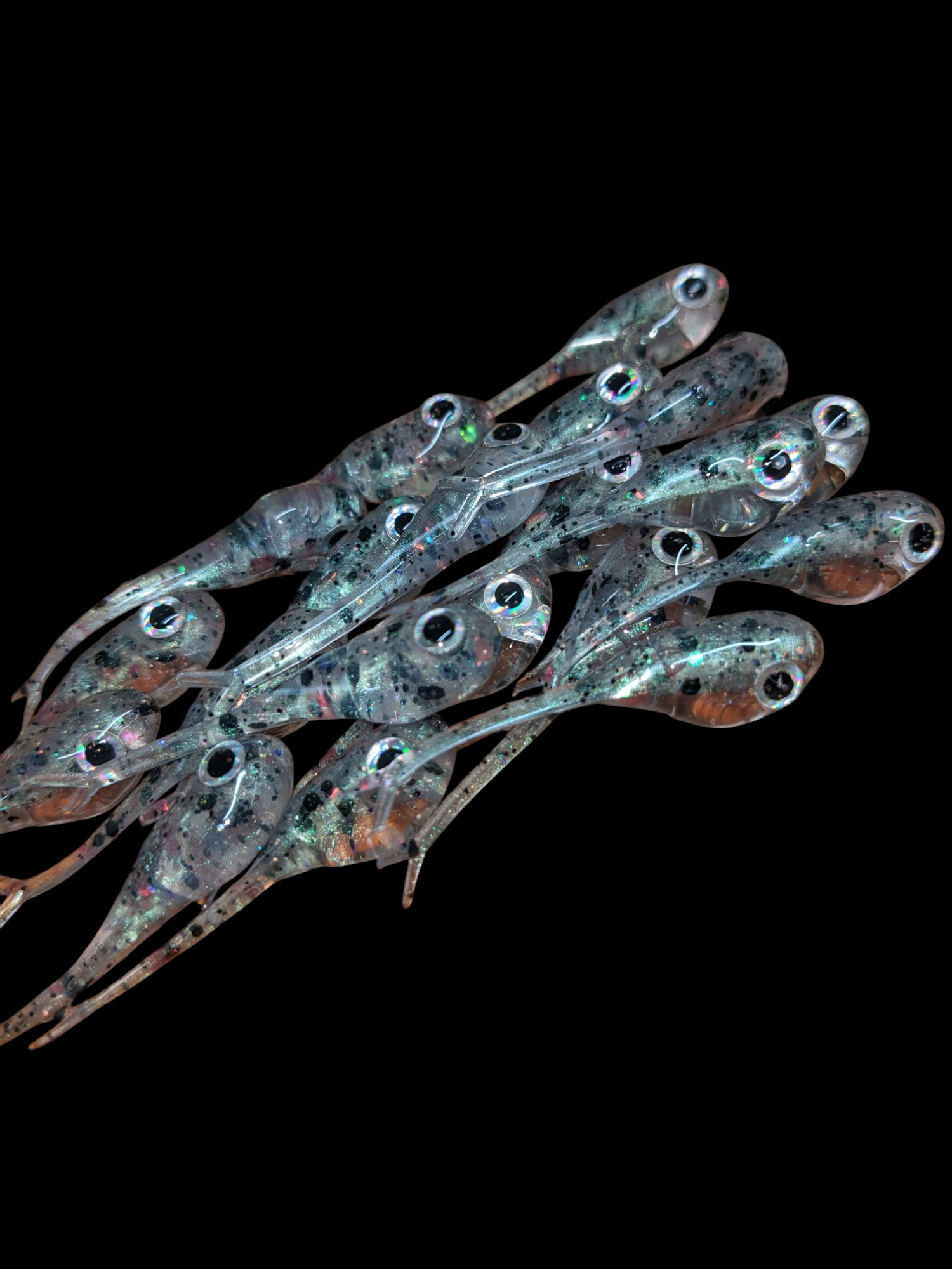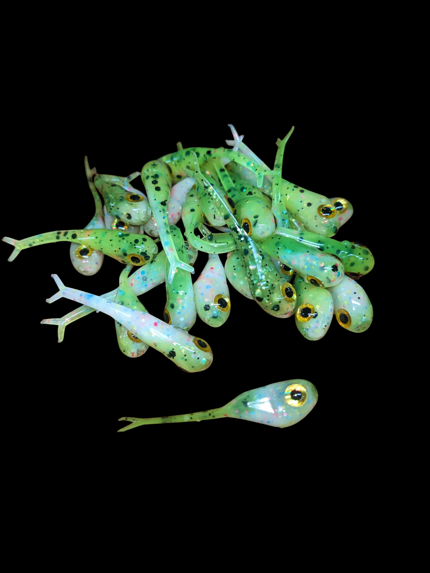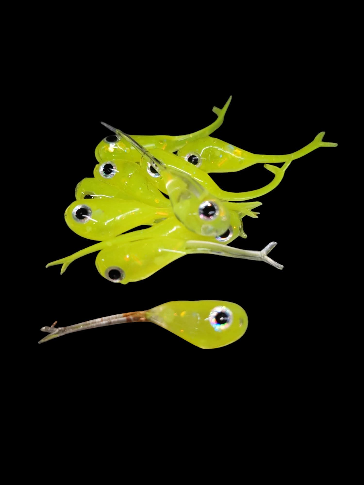 An added dimension on the Split Tail Shad pattern. Attached eyes and a clear dip gives these baits a natural and unique look.