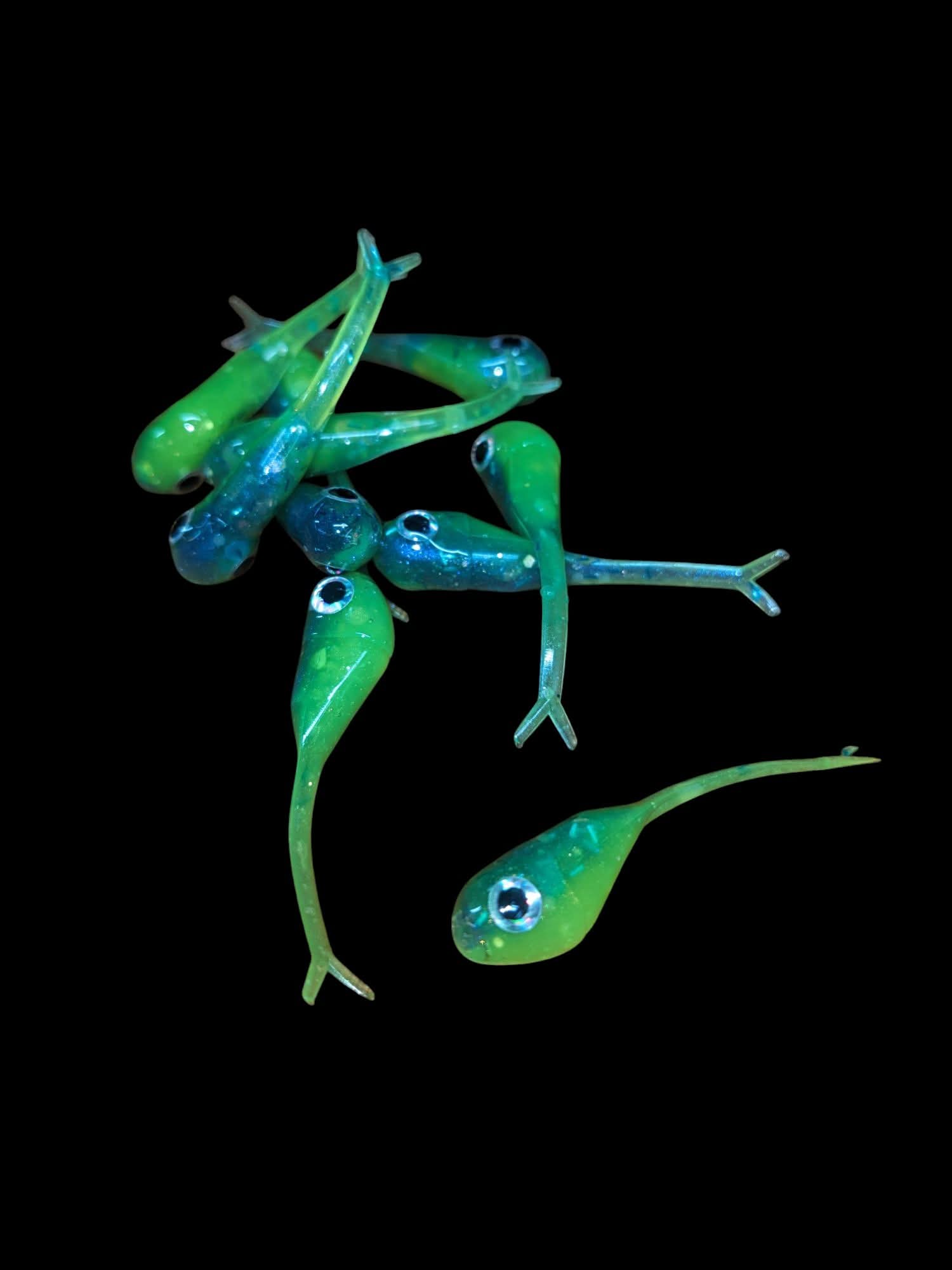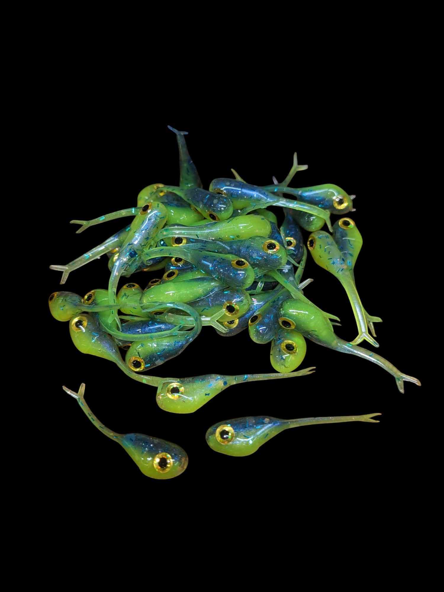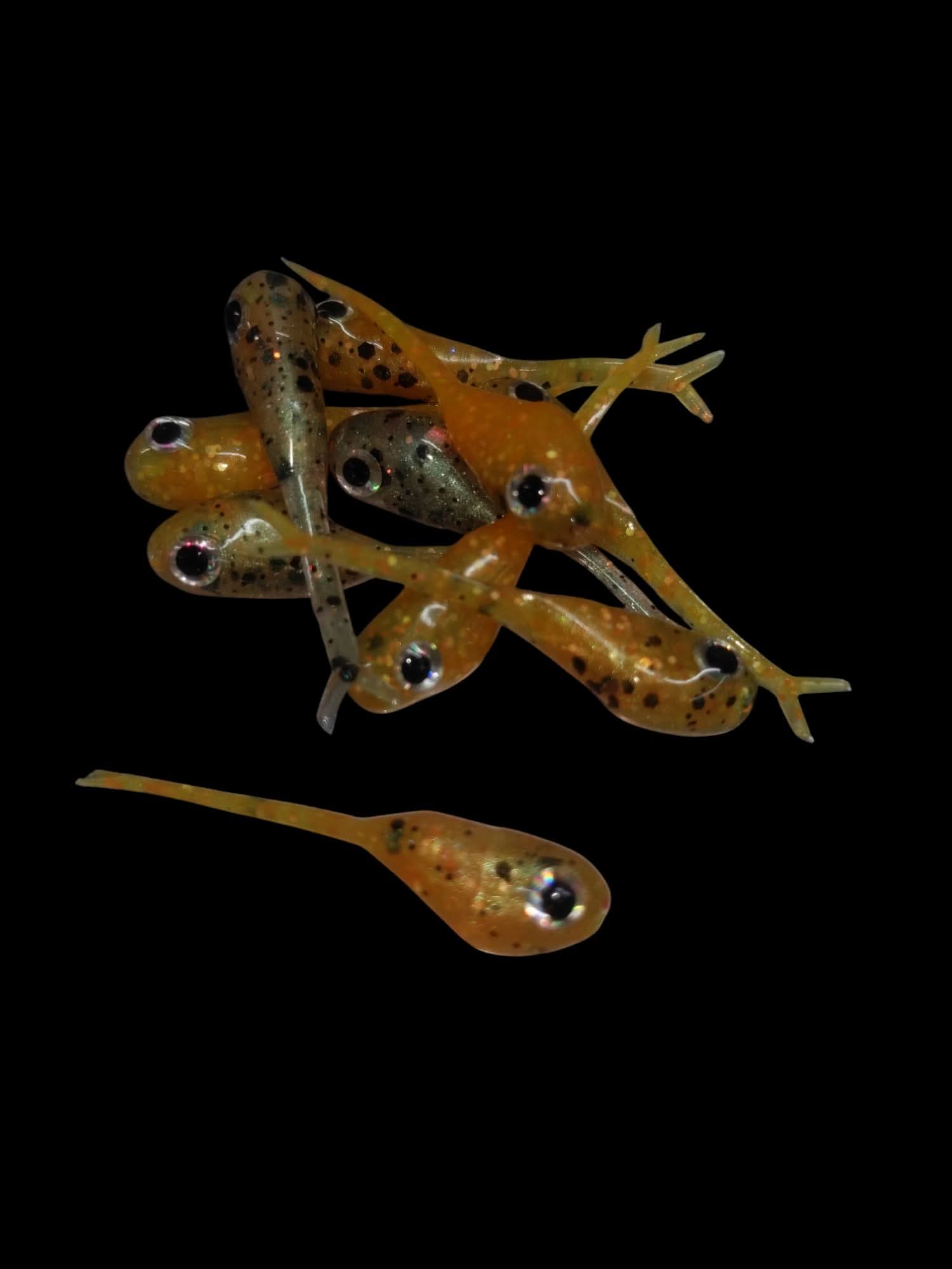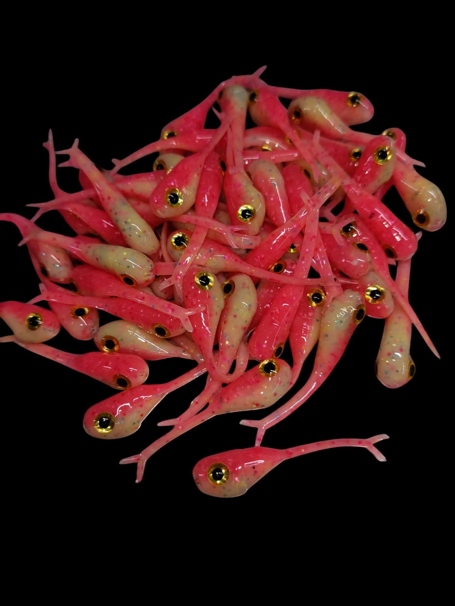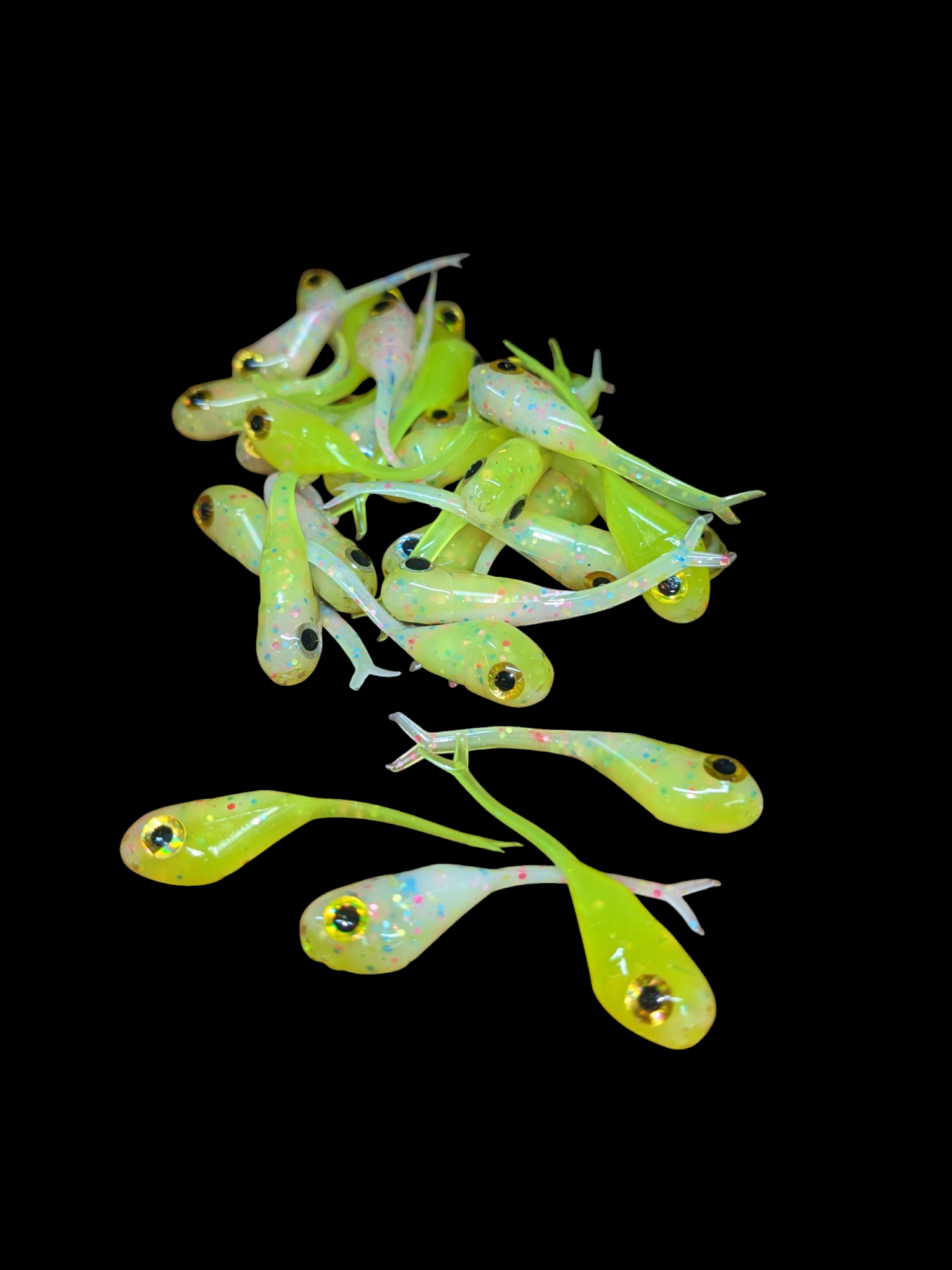 An added dimension on the Split Tail Shad pattern. Attached eyes and a clear dip gives these baits a natural and unique look.